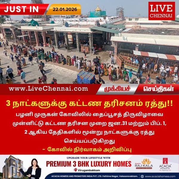 தைப்பூசத்தின்போது பக்தர்கள் அதிக அளவில் வருகை தருவதை கருத்தில் கொண்டு இந்த முடிவு எடுக்கப்பட்டுள்ளது. இந்த மூன்று நாட்களிலும் பக்தர்கள் இலவச தரிசனம் மூலம் மட்டுமே சுவாமி தரிசனம் செய்ய அனுமதி வழங்கப்படும்.