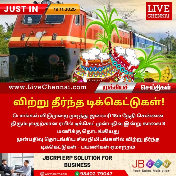 பொங்கல் விடுமுறை முடித்து ஜனவரி 18ம் தேதி சென்னை திரும்புவதற்கான ரயில் டிக்கெட் முன்பதிவு இன்று காலை 8 மணிக்கு தொடங்கியது. முன்பதிவு தொடங்கிய சில நிமிடங்களில் விற்று தீர்ந்த டிக்கெட்டுகள் – பயணிகள் ஏமாற்றம்