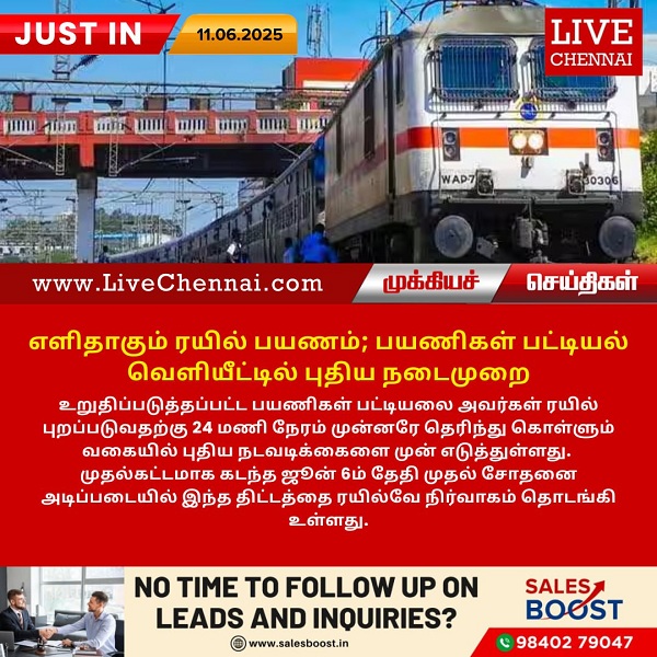 உறுதிப்படுத்தப்பட்ட பயணிகள் பட்டியலை அவர்கள் ரயில் புறப்படுவதற்கு 24 மணி நேரம் முன்னரே தெரிந்து கொள்ளும் வகையில் புதிய நடவடிக்கைளை முன் எடுத்துள்ளது. முதல்கட்டமாக கடந்த ஜூன் 6ம் தேதி முதல் சோதனை அடிப்படையில் இந்த திட்டத்தை ரயில்வே நிர்வாகம் தொடங்கி உள்ளது.