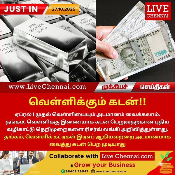 ஏப்ரல் 1 முதல் வெள்ளியையும் அடமானம் வைக்கலாம். தங்கம், வெள்ளிக்கு இணையாக கடன் பெறுவதற்கான புதிய வழிகாட்டு நெறிமுறைகளை ரிசர்வ் வங்கி அறிவித்துள்ளது. தங்கம், வெள்ளிக் கட்டிகள் இடிஎப் ஆகியவற்றை அடமானமாக வைத்து கடன் பெற முடியாது