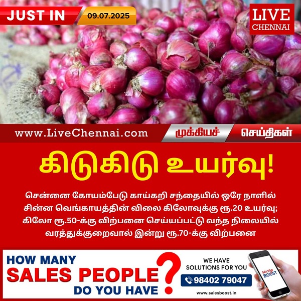 சென்னை கோயம்பேடு காய்கறி சந்தையில் ஒரே நாளில் சின்ன வெங்காயத்தின் விலை கிலோவுக்கு ரூ.20 உயர்வு; கிலோ ரூ.50-க்கு விற்பனை செய்யப்பட்டு வந்த நிலையில் வரத்துக்குறைவால் இன்று ரூ.70-க்கு விற்பனை.