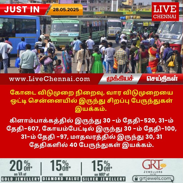 கோடை விடுமுறை நிறைவு, வார விடுமுறையை ஒட்டி சென்னையில் இருந்து சிறப்பு பேருந்துகள் இயக்கம். கிளாம்பாக்கத்தில் இருந்து 30 -ம் தேதி- 520, 31-ம் தேதி-607கோயம்பேட்டில் இருந்து 30 -ம் தேதி-100, 31-ம் தேதி -97, மாதவரத்தில் இருந்து 30, 31 தேதிகளில் 40 பேருந்துகள் இயக்கம்.