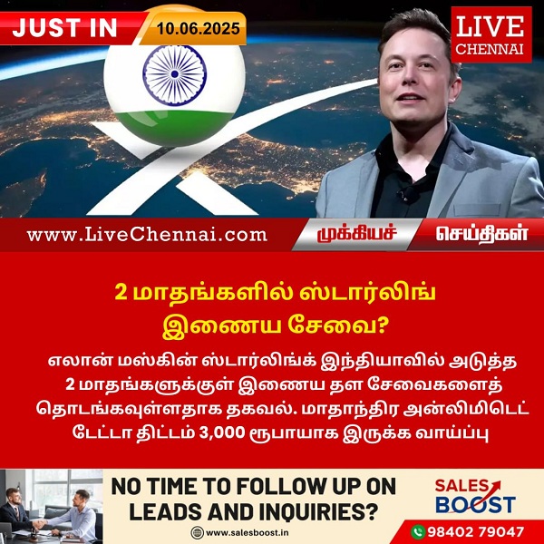 எலான் மஸ்கின் ஸ்டார்லிங்க் இந்தியாவில் அடுத்த 2 மாதங்களுக்குள் இணைய தள சேவைகளைத் தொடங்கவுள்ளதாக தகவல். மாதாந்திர அன்லிமிடெட் டேட்டா திட்டம் 3,000 ரூபாயாக இருக்க வாய்ப்பு.