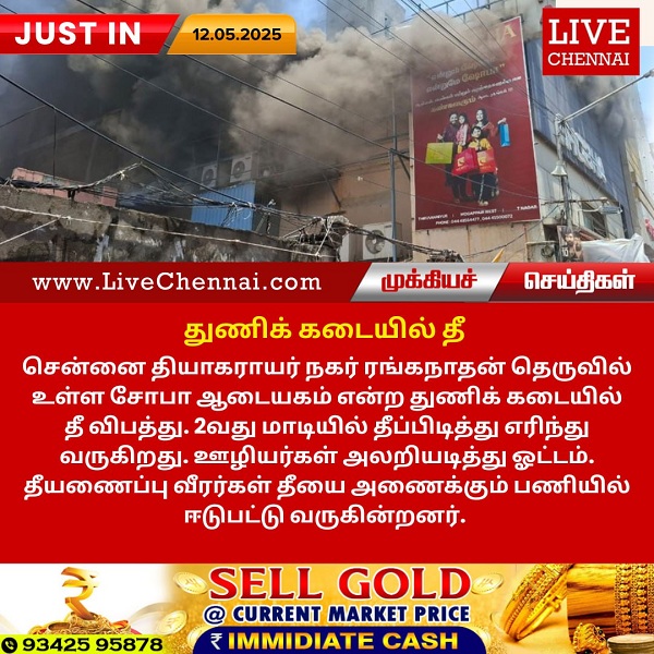 சென்னை தியாகராயர் நகர் ரங்கநாதன் தெருவில் உள்ள சோபா ஆடையகம் என்ற துணிக் கடையில் தீ விபத்து. 2வது மாடியில் தீப்பிடித்து எரிந்து வருகிறது. ஊழியர்கள் அலறியடித்து ஓட்டம். தீயணைப்பு வீரர்கள் தீயை அணைக்கும் பணியில் ஈடுபட்டு வருகின்றனர்.