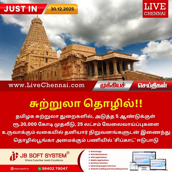 தமிழக சுற்றுலா துறைகளில், அடுத்த 5 ஆண்டுக்குள் ரூ.20,000 கோடி முதலீட்டில், 25 லட்சம் வேலைவாய்ப்புகளை உருவாக்கும் வகையில் தனியார் நிறுவனங்களுடன் இணைந்து தொழில்பூங்கா அமைக்கும் பணியில் ‘சிப்காட்‘ ஈடுபாடு.