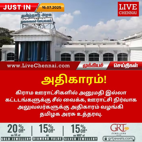 கிராம ஊராட்சிகளில் அனுமதி இல்லா கட்டடங்களுக்கு சீல் வைக்க, ஊராட்சி நிர்வாக அலுவலர்களுக்கு அதிகாரம் வழங்கி தமிழக அரசு உத்தரவு.