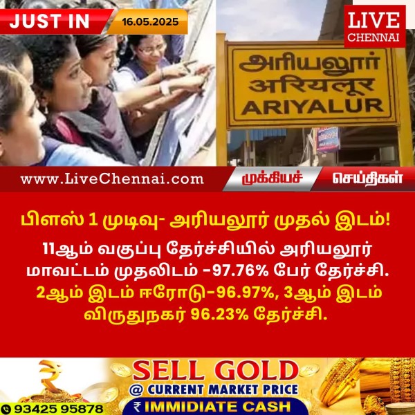 11ஆம் வகுப்பு தேர்ச்சியில் அரியலூர் மாவட்டம் முதலிடம் -97.76% பேர் தேர்ச்சி. 2ஆம் இடம் ஈரோடு-96.97%, 3ஆம் இடம் விருதுநகர் 96.23% தேர்ச்சி.