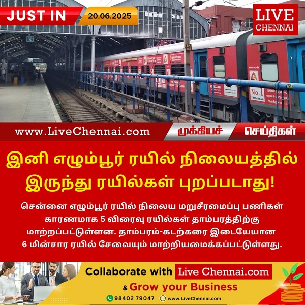 சென்னை எழும்பூர் ரயில் நிலைய மறுசீரமைப்பு பணிகள் காரணமாக 5 விரைவு ரயில்கள் தாம்பரத்திற்கு மாற்றப்பட்டுள்ளன. தாம்பரம்-கடற்கரை இடையேயான 6 மின்சார ரயில் சேவையும் மாற்றியமைக்கப்பட்டுள்ளது.