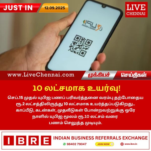 செப்.15 முதல் யுபிஐ பணப் பரிவர்த்தனை வரம்பு தற்போதைய ரூ.2 லட்சத்திலிருந்து 10 லட்சமாக உயர்த்தப்படுகிறது.. காப்பீடு, கடன்கள், முதலீடுகள் போன்றவற்றுக்கு ஒரே நாளில் யுபிஐ மூலம் ரூ.10 லட்சம் வரை பணம் செலுத்த முடியும்.