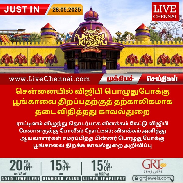 சென்னையில் விஜிபி பொழுதுபோக்கு பூங்காவை திறப்பதற்குத் தற்காலிகமாக தடை விதித்தது காவல்துறை.ராட்டினம் விழுந்தது தொடர்பாக விளக்கம் கேட்டு விஜிபி மேலாளருக்கு போலீஸ் நோட்டீஸ்; விளக்கம் அளித்து ஆய்வாளர்கள் சமர்ப்பித்த பின்னர் பொழுதுபோக்கு பூங்காவை திறக்க காவல்துறை அறிவிப்பு.
