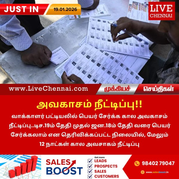 வாக்காளர் பட்டியலில் பெயர் சேர்க்க கால அவகாசம் நீட்டிப்பு.டிச.19ம் தேதி முதல் ஜன.18ம் தேதி வரை பெயர் சேர்க்கலாம் என தெரிவிக்கப்பட்ட நிலையில், மேலும் 12 நாட்கள் கால அவசாகம் நீட்டிப்பு.