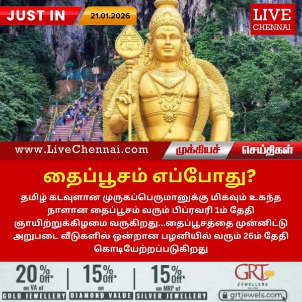 தமிழ் கடவுளான முருகப்பெருமானுக்கு மிகவும் உகந்த நாளான தைப்பூசம் வரும் பிப்ரவரி 1ம் தேதி ஞாயிற்றுக்கிழமை வருகிறது.தைப்பூசத்தை முன்னிட்டு அறுபடை வீடுகளில் ஒன்றான பழனியில் வரும் 26ம் தேதி கொடியேற்றத்துடன் தொடங்குகிறது.